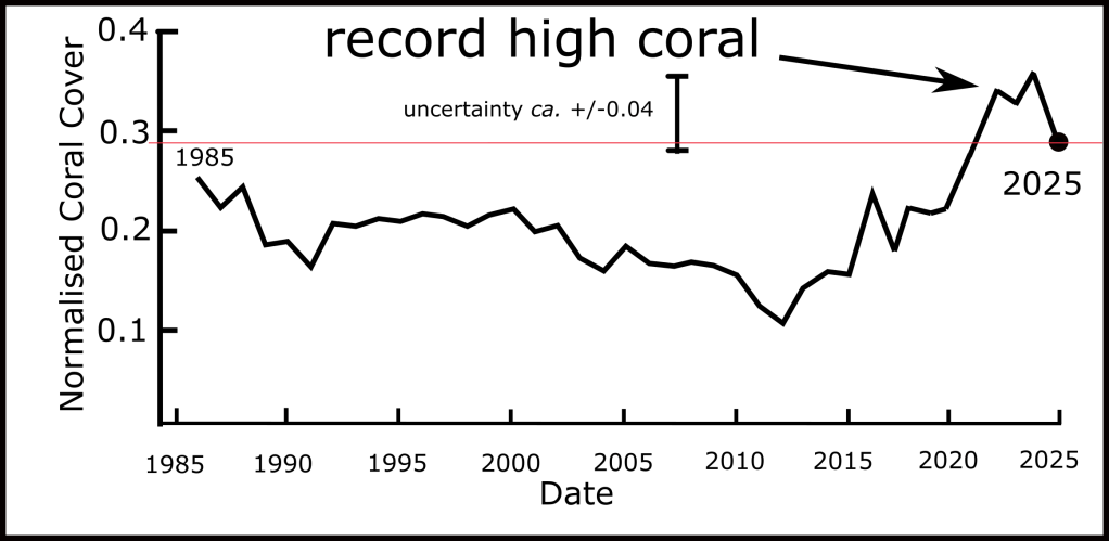 For example, look at the coral cover for 2024. It reached record high levels. Coral cover naturally fluctuates, but record high coral cover must make one question if the reef is in such bad state.