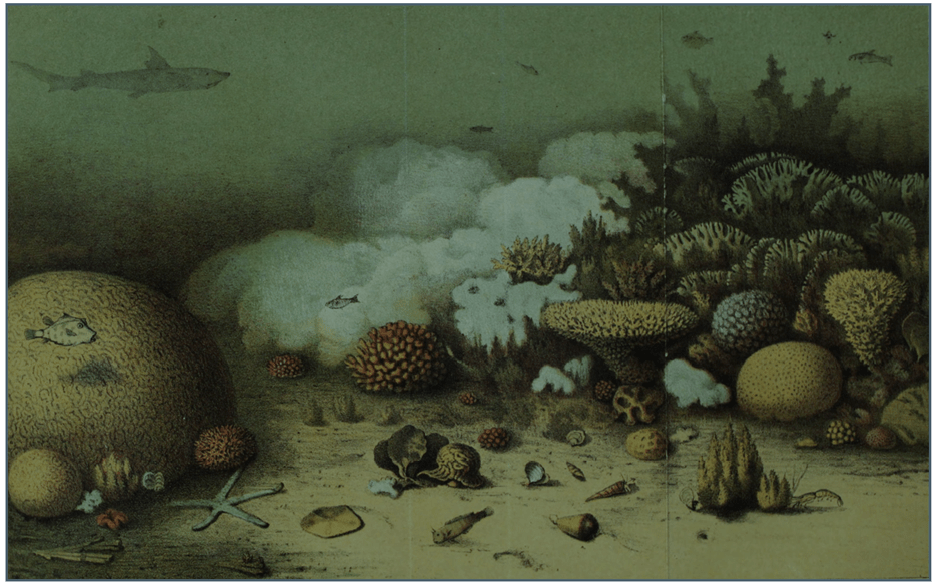 Lithograph of bleaching in 1862 by von Ransonnet.(see Cedhagen[iv]) The white coral is clearly bleached.